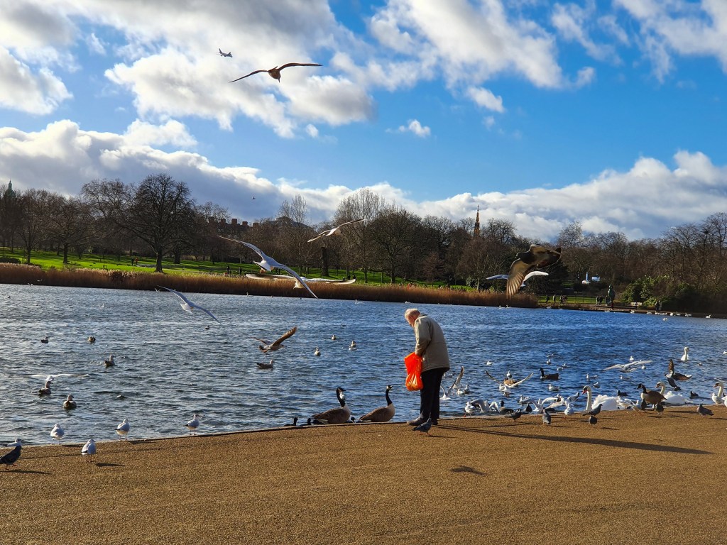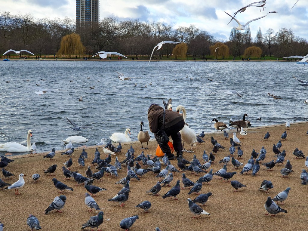 Rendkívül érdekes volt látni a Kis Sándorpapagáj populációt a Hyde Parkban, a legérdekesebb az volt, hogy nem is fáztak. Külön turistacsoportok érkeznek magvakkal, almákkal etetni a papagájokat, akik annyira szelídek már, hogy kézből esznek. Ezt a galambok is megteszik.
