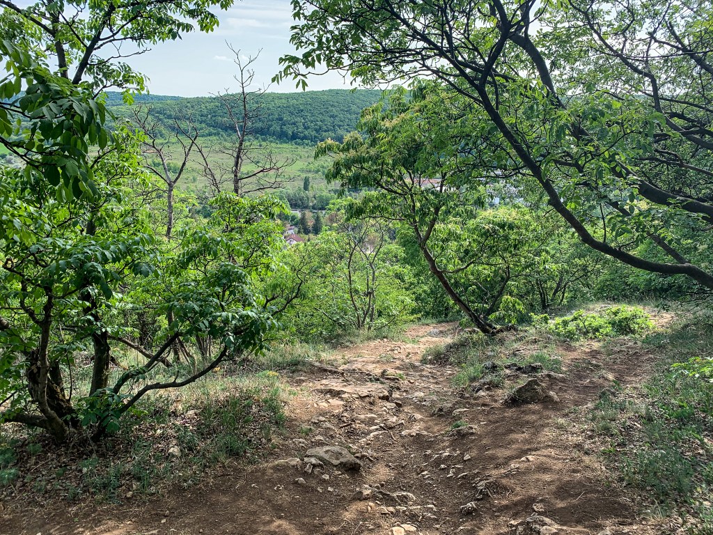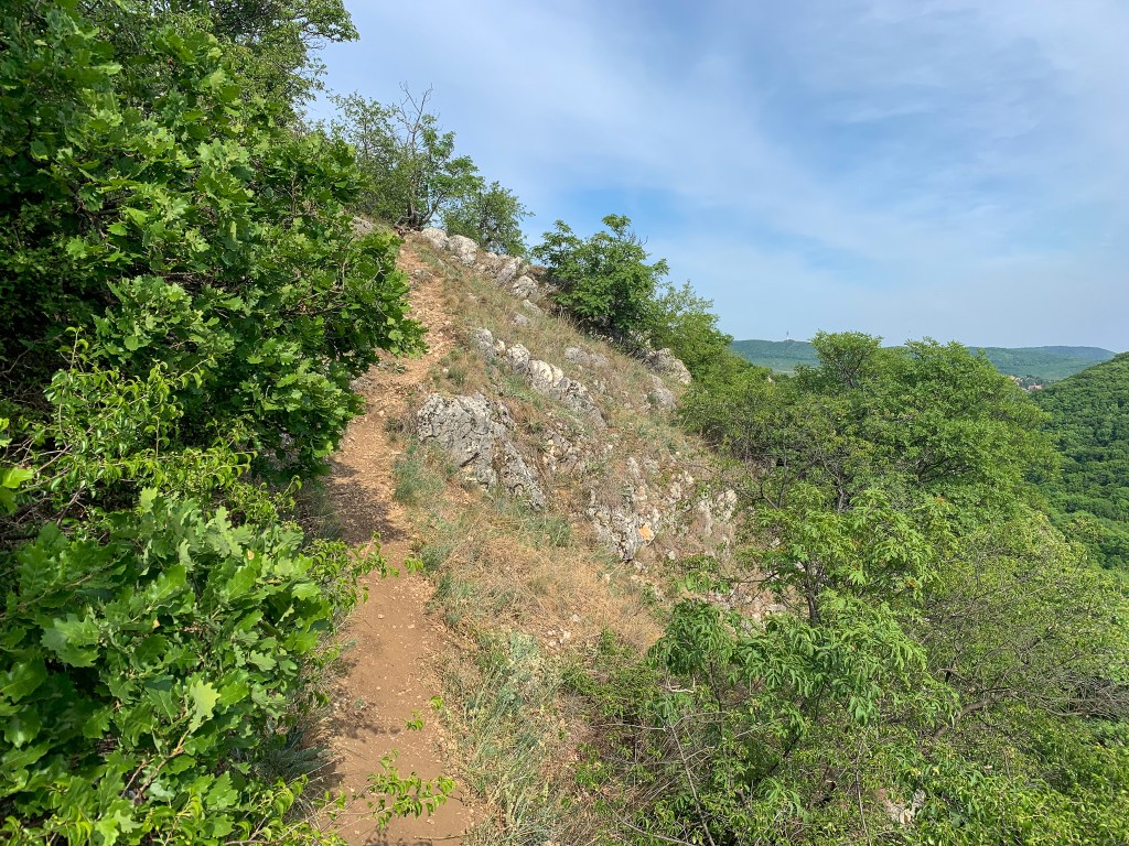 Ugyanolyan erdős, nyugodt terepen haladunk, mint amilyen a szakasz nagyobb része, egészen egy sziklás, kemény lejtőn kell leereszkednünk, a Remete-szurdokba.
